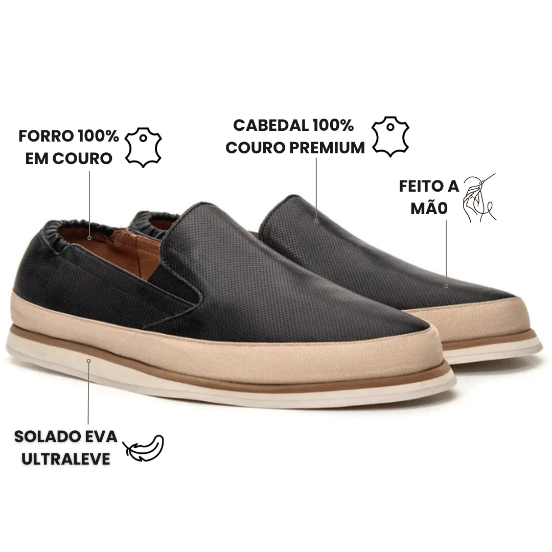 O Slip On Atlanta conta com um solado EVA com tapete de borracha ultraleve, proporcionando uma pisada confortável e segura. O calçado se adapta facilmente a qualquer tipo de pé, graças aos elásticos posicionados na parte de trás e nas laterais, garantindo praticidade no calce e ajuste ideal. Além disso, o forro 100% em couro proporciona uma experiência de conforto premium, enquanto o acabamento feito à mão exibe a atenção a cada detalhe, elevando o padrão de qualidade.